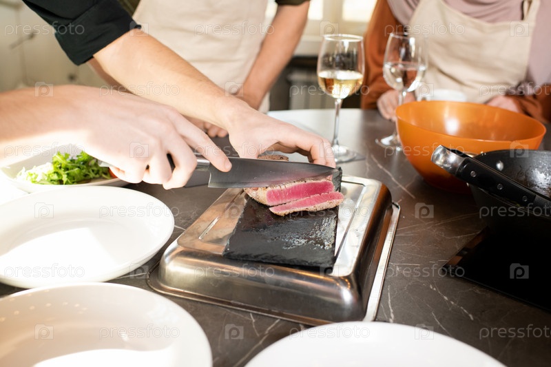 Руки молодого мужского тренера по приготовлению пищи, нарезающего кусок копченой или жареной говядины