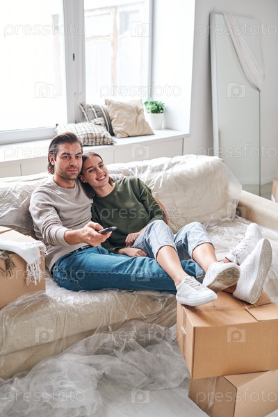 Счастливая молодая спокойная пара отдыхает на диване, сидя перед телевизором