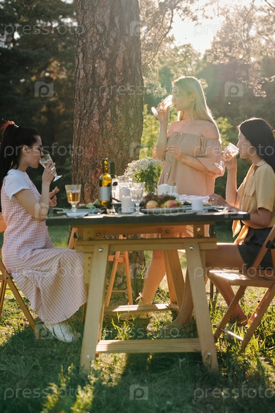 Три девушки в повседневной одежде выпивают у обеденного стола после ужина на свежем воздухе