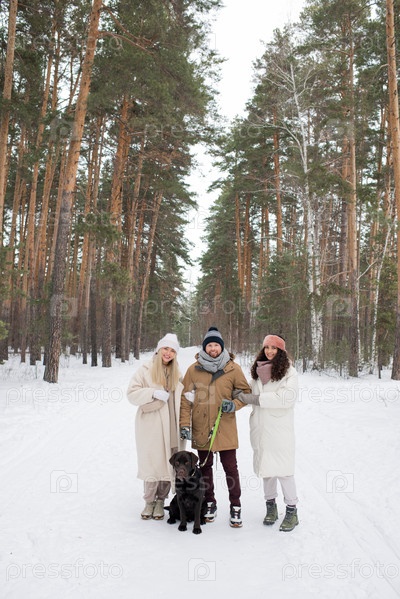 Молодой человек с черным ретривером и две девушки в зимней одежде стоят на дороге