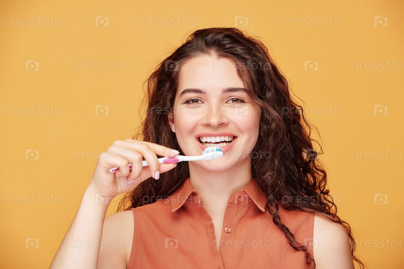 Молодая смеющаяся брюнетка с здоровой улыбкой чистит зубы