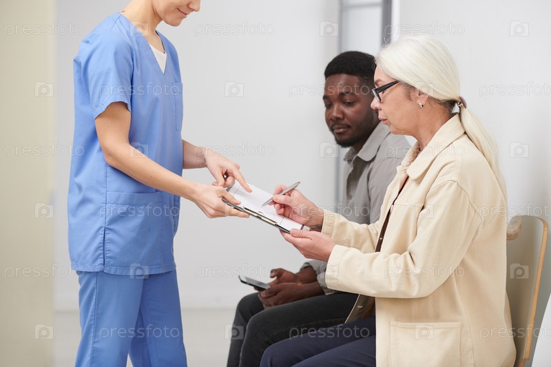 Боковой снимок стильной пожилой женщины, сидящей в очереди в больнице и подписывающей важные медицинские документы