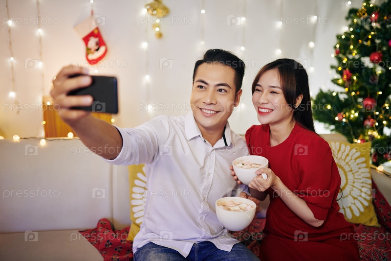 Пара, делающая селфи с чашками какао