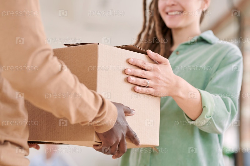 Близкий план улыбающейся девушки в непринужденной рубашке, получающей большую картонную коробку от чёрного доставщика