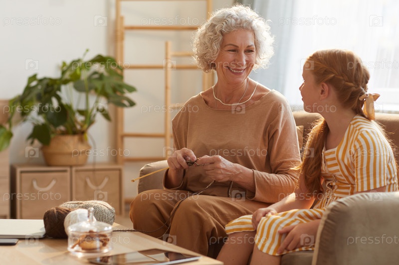 Улыбающаяся старшая женщина вяжет с внучкой
