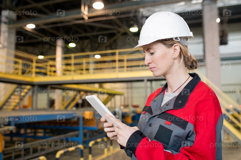 Работница фабрики, использующая планшетный компьютер