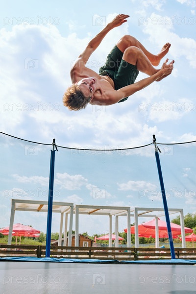 Молодой топлес-спортсмен в зеленых шортах прыгает на батуте снаружи