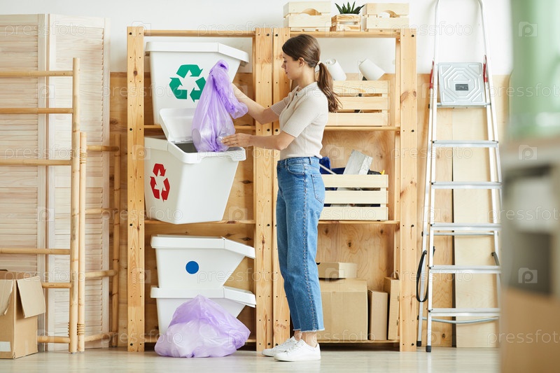 Женщина сортирует мусор в контейнеры
