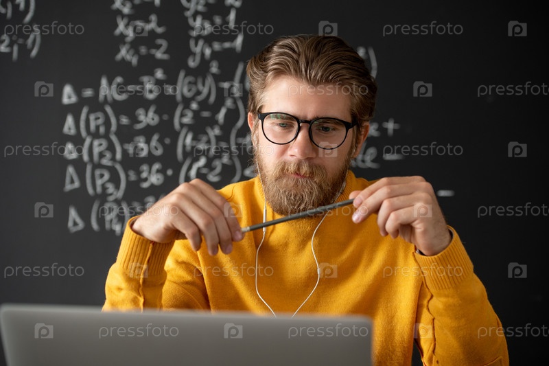 Молодой бородатый учитель в очках слушает одного из онлайн-студентов