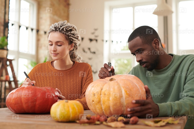 Серьезная молодая мультиэтническая пара сидит за столом и готовит тыквы для резьбы