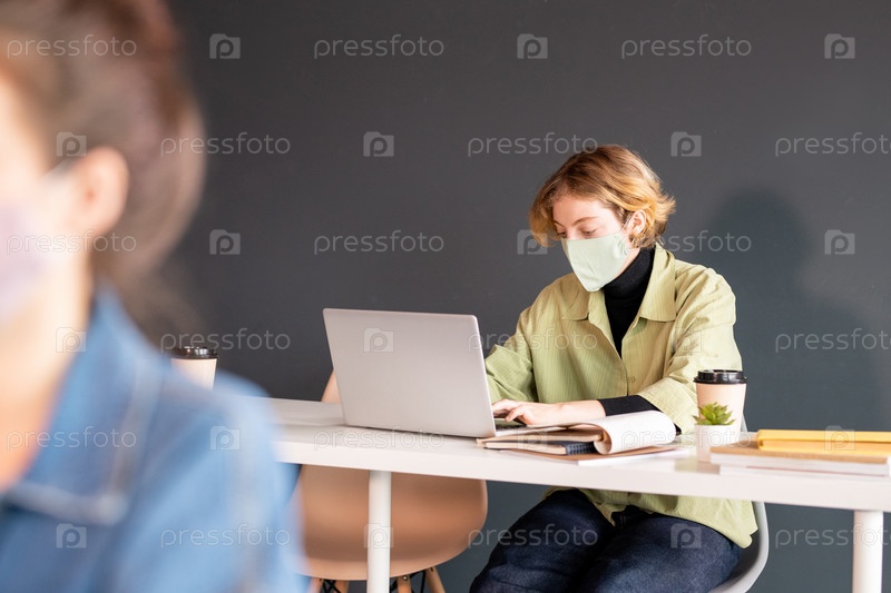 Молодая блондинка-бизнесмен в повседневной одежде и защитной маске сидит у своего стола