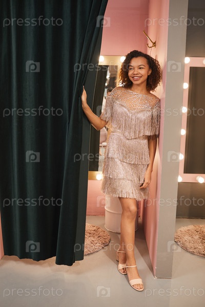 Женщина смешанной расы пробует на себе платья в раздевалке