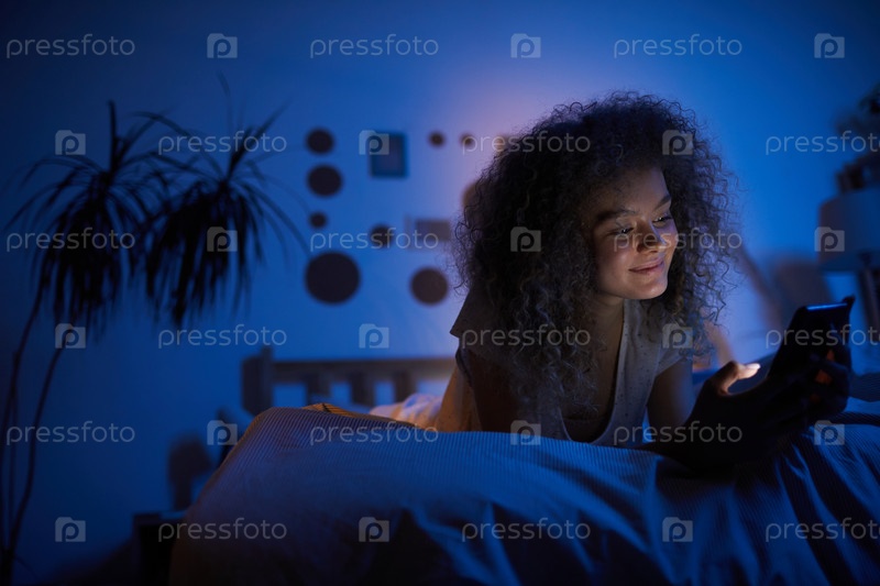 Улыбающаяся женщина использует смартфон ночью