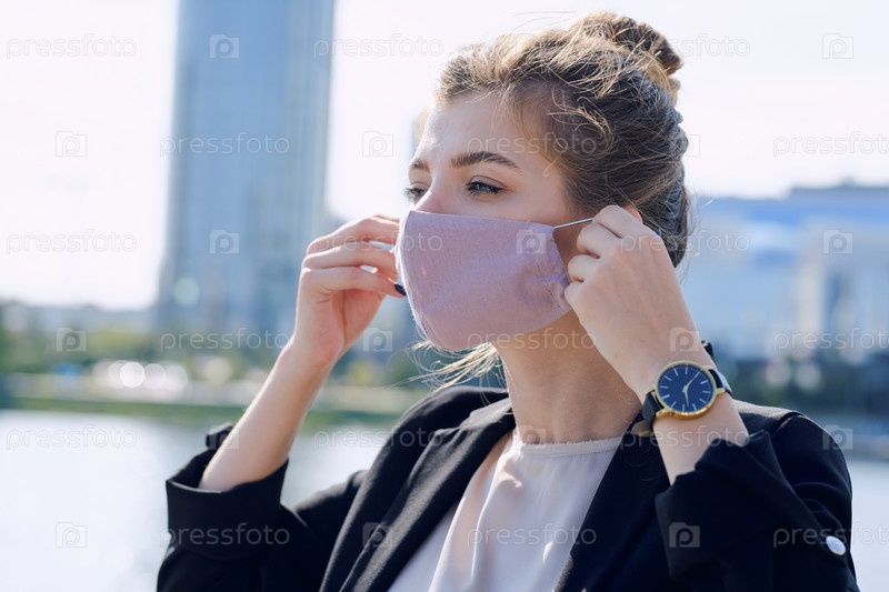 Молодая элегантная деловая женщина в формальной одежде надевает защитную маску