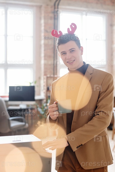 Веселый бизнесмен в рождественской повязке смотрит на тебя и пьет кофе