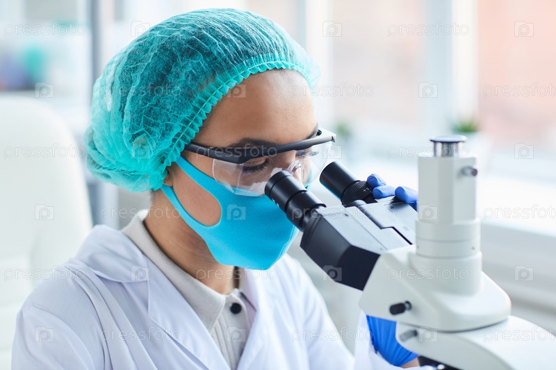 Женщина, глядящая в микроскоп