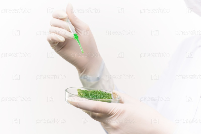 Ученый сбрасывает жидкое вещество в чашу Петри с биологическим материалом