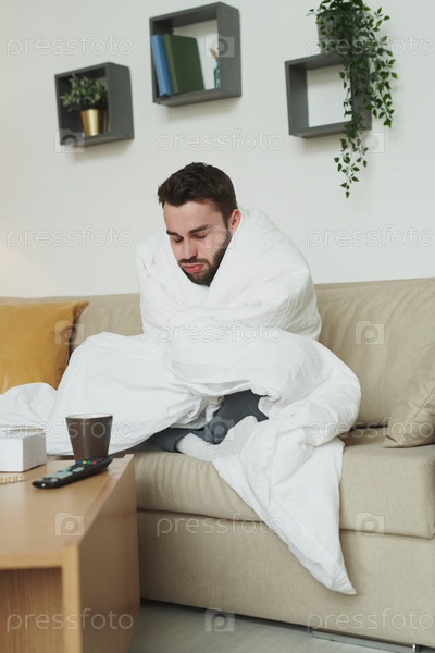 Больной парень, завернутый в одеяло сидит на диване перед столом с лекарствами