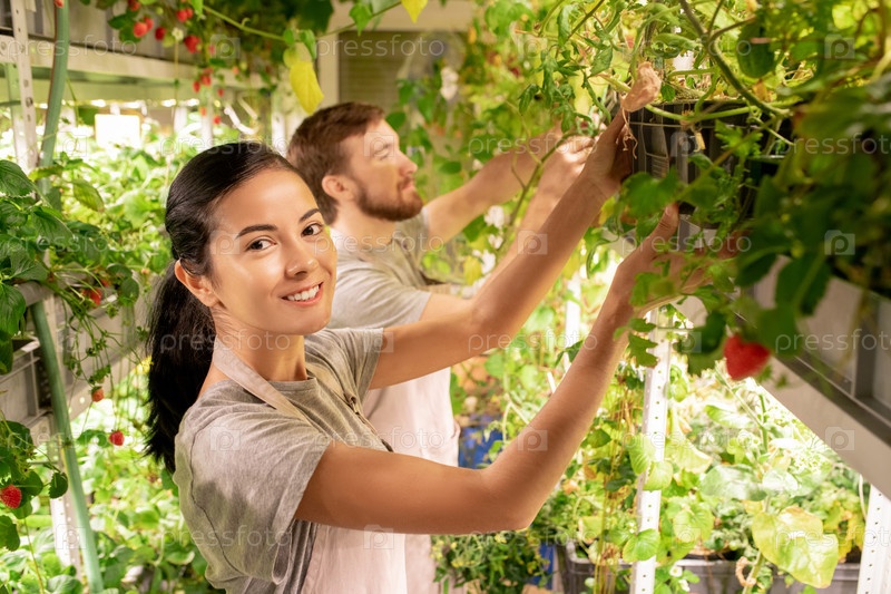 Женщина изучает саженцы в теплице