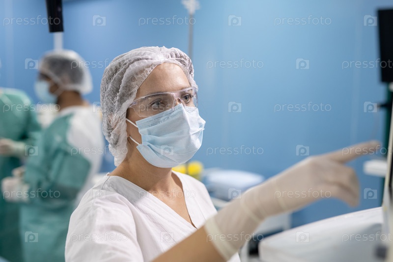 Молодой помощник хирурга в перчатках, маске и униформе указывает на дисплей