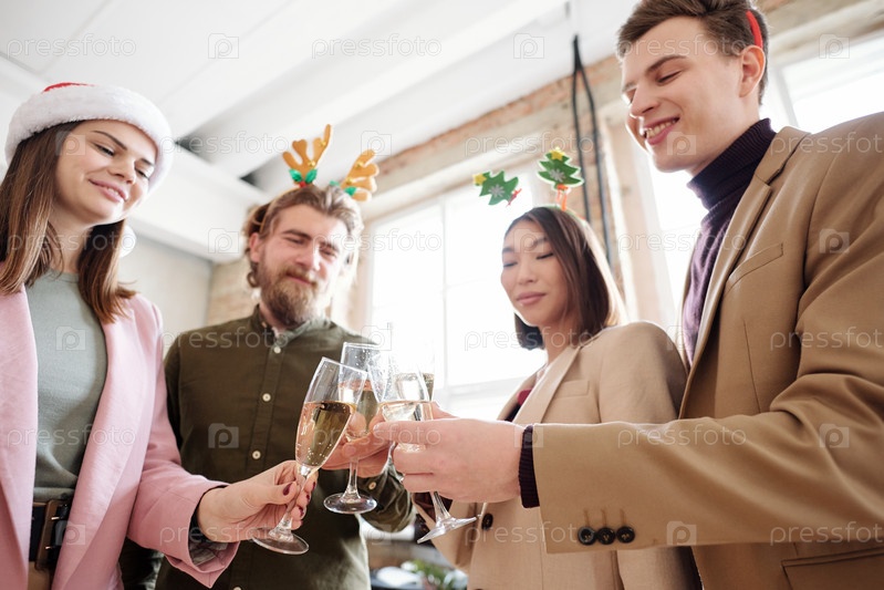 Группа молодых веселых менеджеров, колочущих с флейтами шампанского в рождественский день