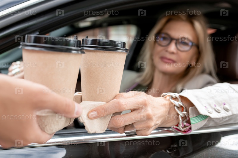 Рука зрелой женщины, принимающей два бумажных бокала кофе через окно машины