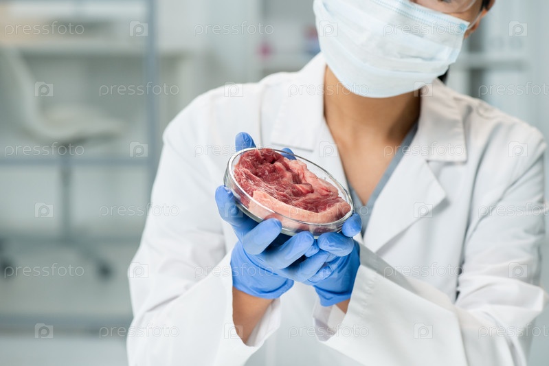 Перчаточные руки молодой женщины-научного исследователя - кусок сырого мяса из овощей