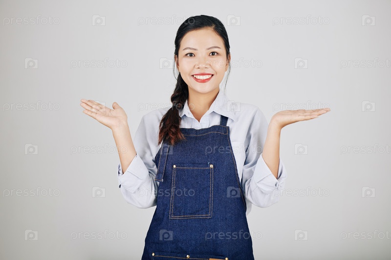 Веселая женщина сжимает плечами