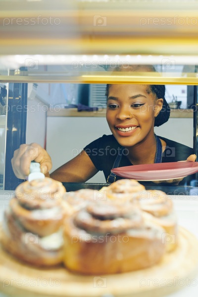 Официантка забирает булочку с корицей из витрины