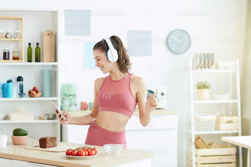Молодая женщина танцует на кухне Fit