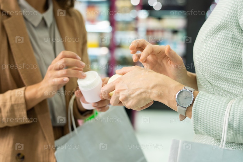 Руки двух молодых элегантных потребителей с бумажными пакетами, тестирующих косметический крем