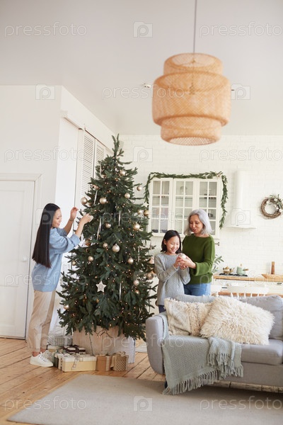 Семья украшает рождественскую елку