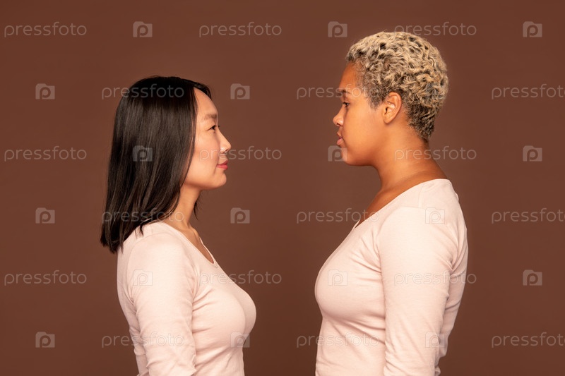 Боковой вид двух молодых межкультурных женщин в белых пуловерах перед камерой