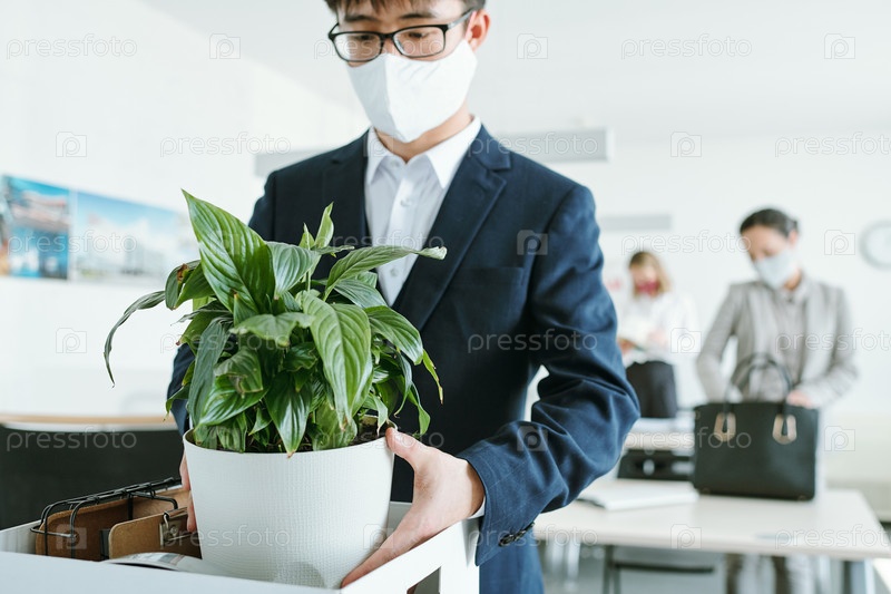 Молодой азиатский бизнесмен в формальной одежде и защитной маске выносит цветочный горшок