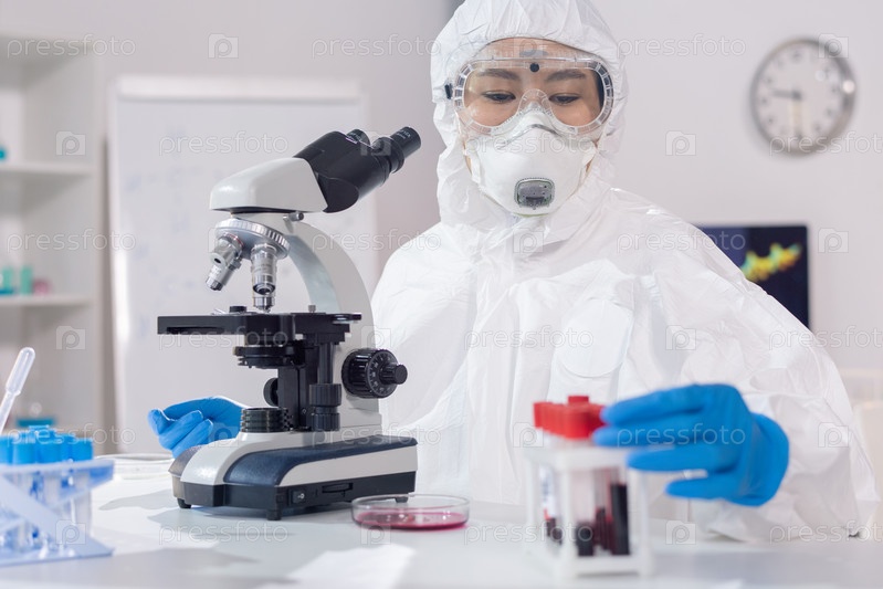 Молодая женщина в комбинезонах, перчатках, маске и защитных очках работает в лаборатории