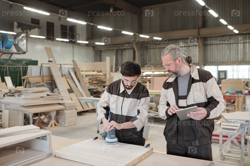Молодой стажер в защитных очках шлифовывает поверхность деревянной заготовки