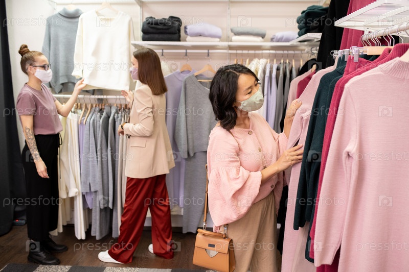 Молодая азиатская женщина-клиент в маске и розовой умной блузке стоит у стойки