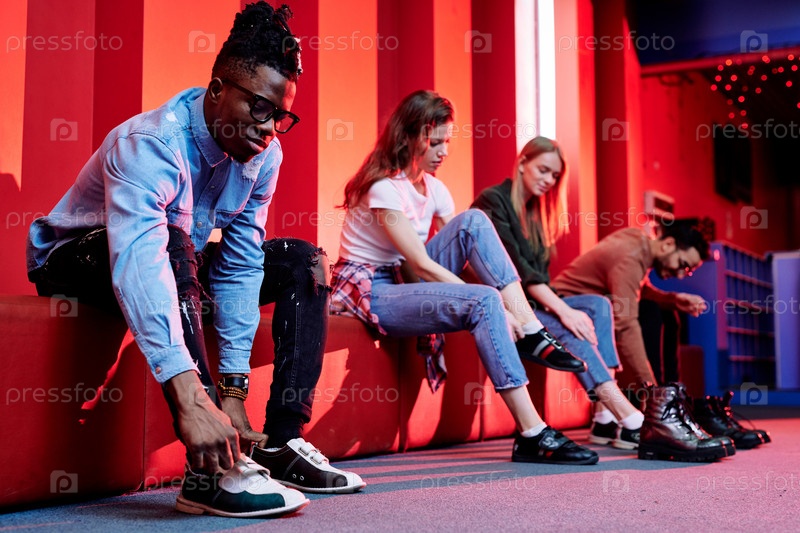 Африканский парень в черных джинсах и джинсовой рубашке сидит на красной кожаной скамейке