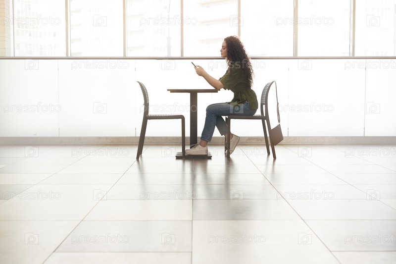 Молодая женщина использует смартфон в футуристическом интерьере