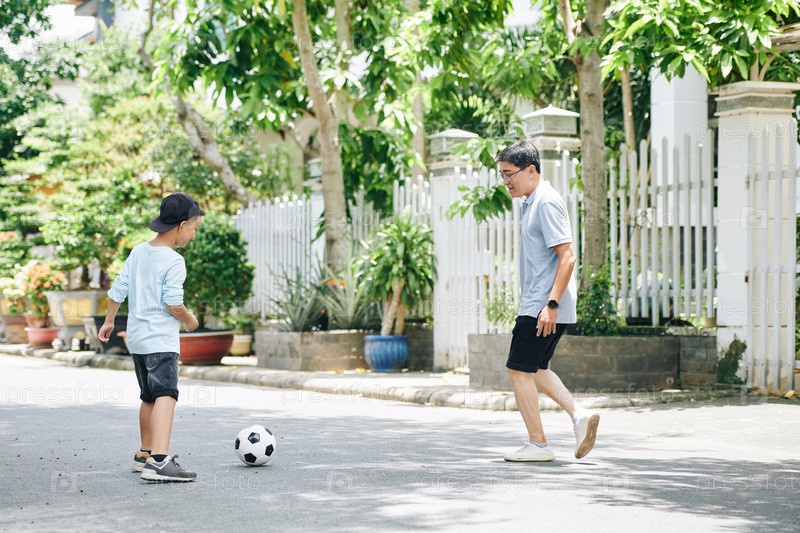 Отец играет в футбол с сыном-подростком