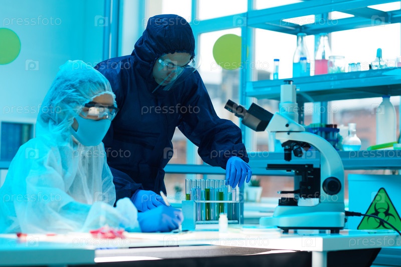 Ученые, носящие опасные костюмы в лаборатории