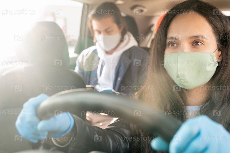 Серьезная женщина-водитель такси в защитной маске и перчатках, держащаясь за бык