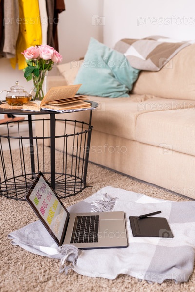 Ноутбук и блокнот со стилусом на пластинке на полу рядом с диваном и маленьким столом