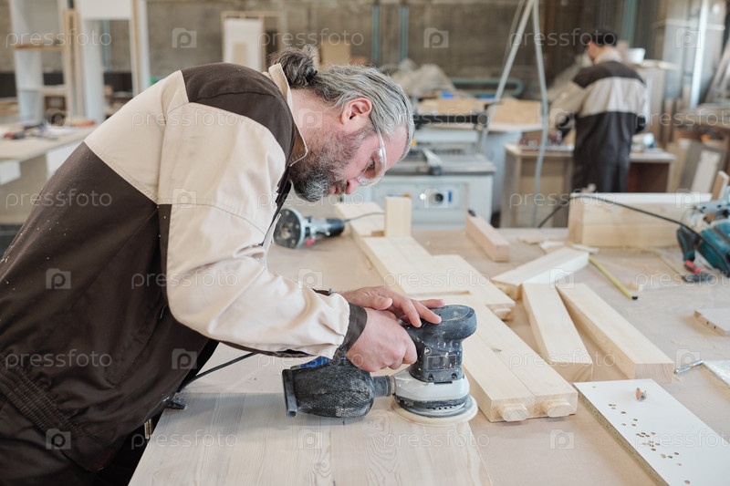 Зрелый работник мебели, производящей фабрику сглаживание поверхности заготовки