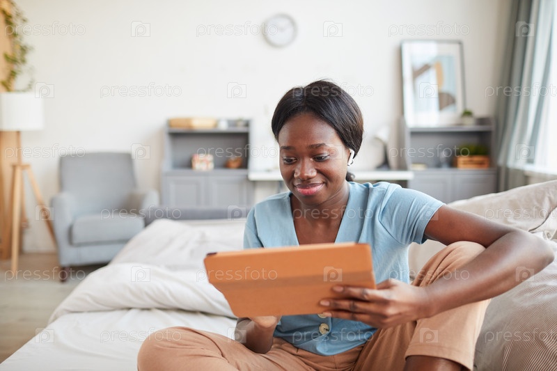 Афроамериканская женщина использует планшет на кровати