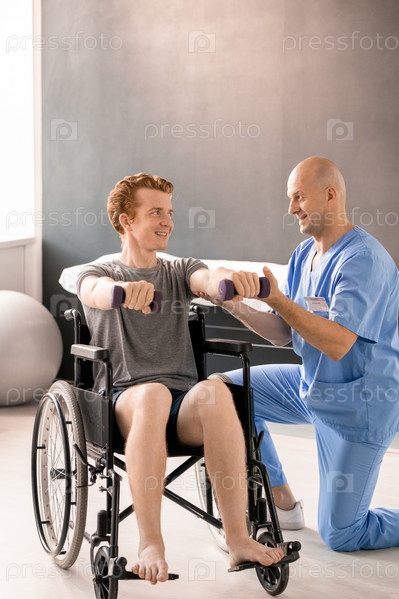 Зрелый врач в форме помогает молодому пациенту с гантеликами на инвалидном кресле