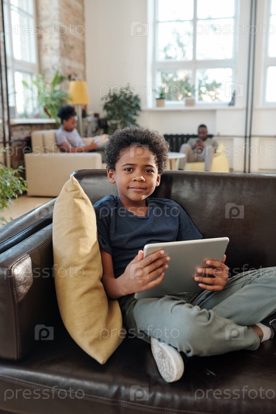 Милый мальчик в повседневной одежде сидит на диване и смотрит онлайн видео