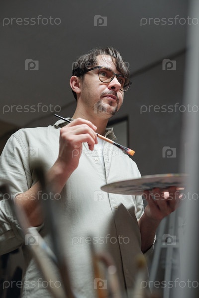 Серьезный молодой человек с цветовой палитрой и paintbruh внимательно смотрит на эстафету