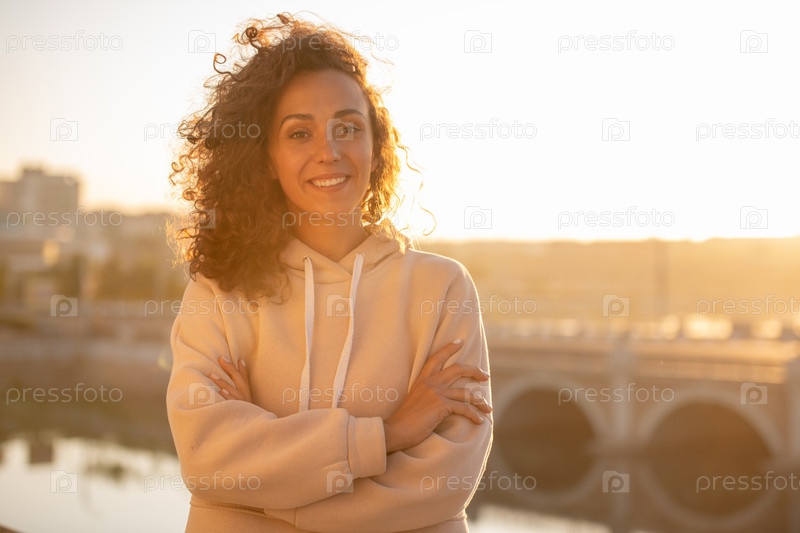 Молодая экстатическая спортсменка в леггинсах и толстовке с капюшоном, держа руки поднятыми