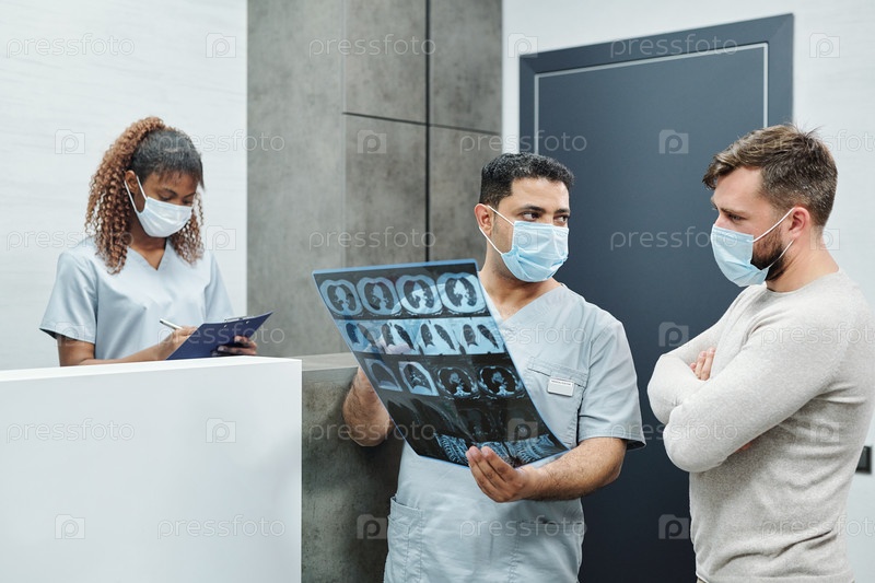 Серьезный мужчина-радиолог в форме и маске показывает рентгеновское изображение пациенту